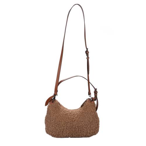 Τσάντα μεσαίου μεγέθους, ώμου σε πούρο χρώμα με φερμουάρ και γούνινη υφή