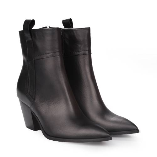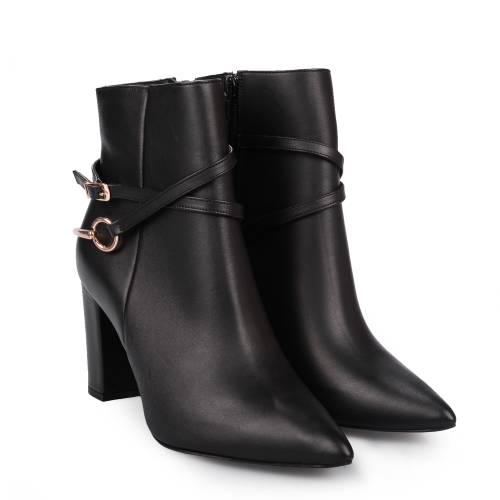 Μυτερό δερμάτινο μποτάκι, σε μαύρο χρώμα, με φερμουάρ και μεταλλικό διακοσμητικό