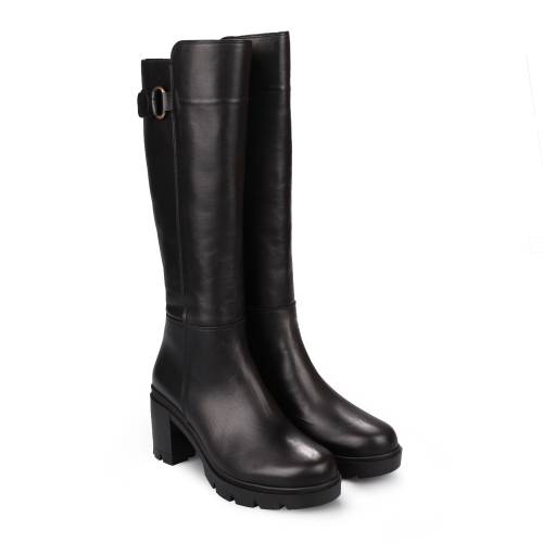 Μπότα δερμάτινη κάτω απο το γόνατο σε μαύρο χρώμα, με αγκράφα και φερμουάρ για άνετη εφαρμογή