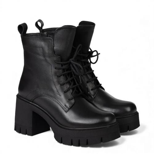 Μποτάκι δερμάτινο δετό σε μαύρο χρώμα, με μοντέρνα σόλα και φερμουάρ στα πλάγια για άνετη εφαρμογή