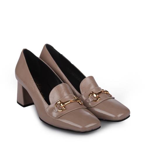 Γόβα δερμάτινη λουστρίνι καρέ σε πούρο χρώμα με αγκράφα. Διαθέτει δέρμα εσωτερικά με δερμάτινο πάτο
