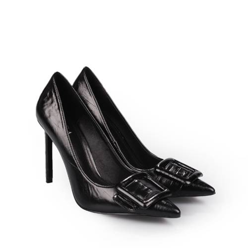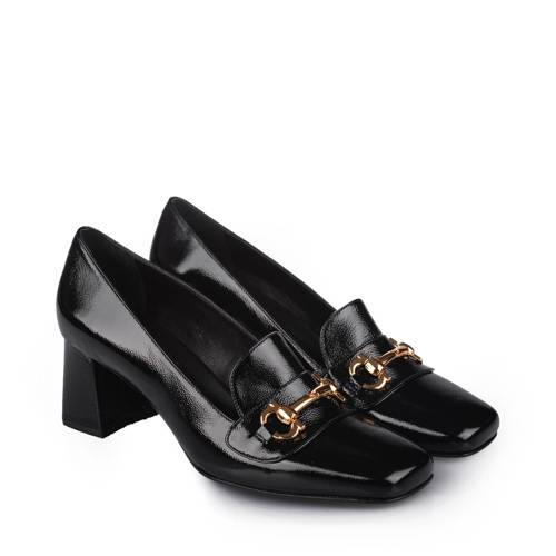 Γόβα δερμάτινη λουστρίνι καρέ σε μαύρο χρώμα με αγκράφα. Διαθέτει δέρμα εσωτερικά με δερμάτινο πάτο