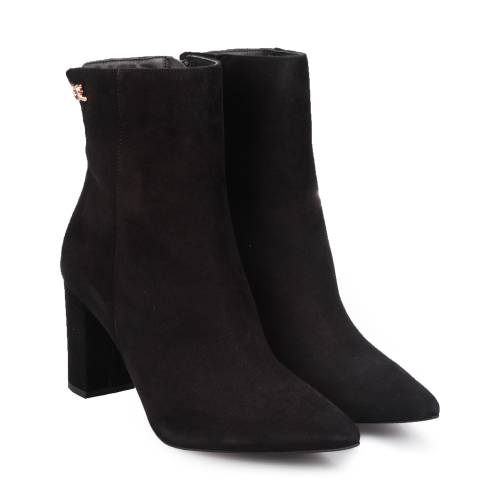 Μυτερό δερμάτινο μποτάκι, σε μαύρο χρώμα, με φερμουάρ και μεταλλικό διακοσμητικό