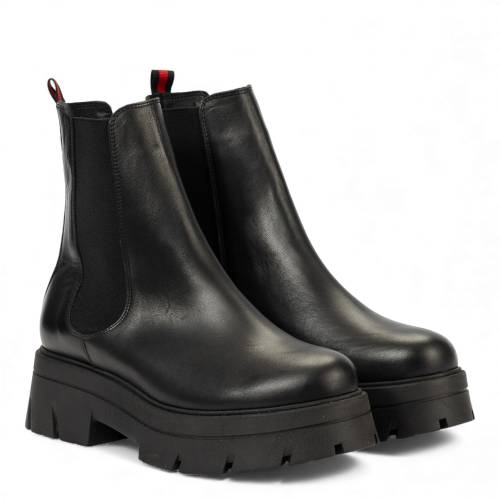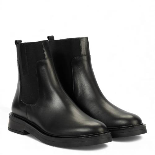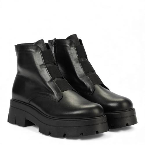 Μποτάκι δερμάτινο σε μαύρο χρώμα, με φερμουάρ στη μία πλευρά και λάστιχο στην άλλη για άνετη εφαρμογή
