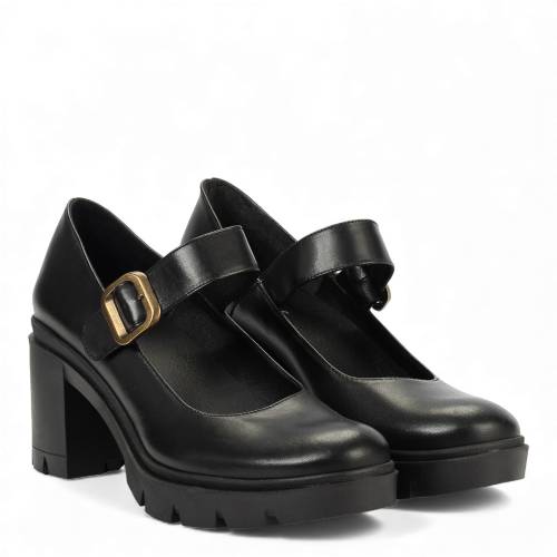 Δερμάτινη γόβα με χοντρό τακούνι και μπαρέτα σε μαύρο χρώμα