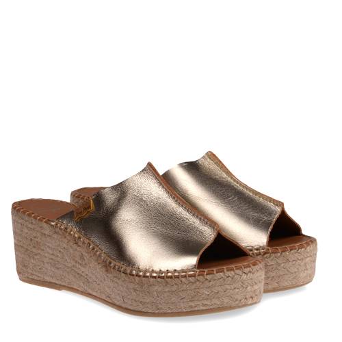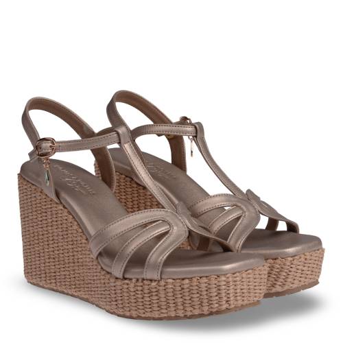 Κατασκευασμένο από δέρμα σε μεταλλιζέ απόχρωση με πλατφόρμα ψάθινης όψης, προσφέρει καλοκαιρινή κομψότητα και σταθερότητα σε κάθε βήμα.