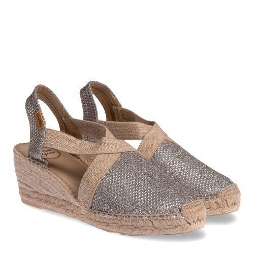 Κατασκευασμένο από ύφασμα με μεταλλική πλέξη και σφήνα τύπου espadrille, προσφέρει σταθερότητα και κομψό καλοκαιρινό ύφος.