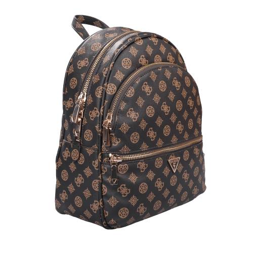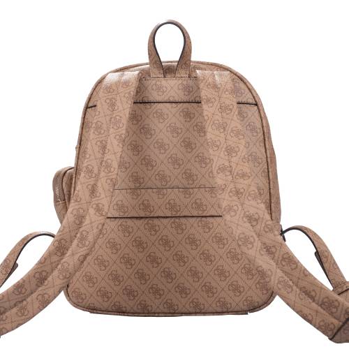 Σακίδιο πλάτης μεσαίου μεγέθους με φερμουάρ και εξωτερικές θήκες σε καφέ χρώμα με το logo της Guess