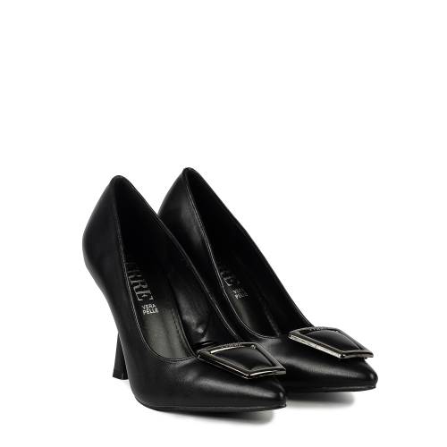 Γόβα μυτερή με λεπτό τακούνι και chic αγκράφα στο μπροστά μέρος, σε μαύρο χρώμα