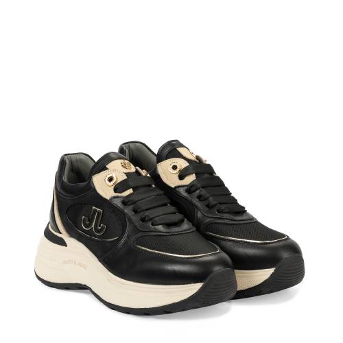 Δερμάτινο αθλητικό δετό σε μαύρο χρώμα με μπέζ δίπατη σόλα και μπέζ χρυσές λεπτομέρειες