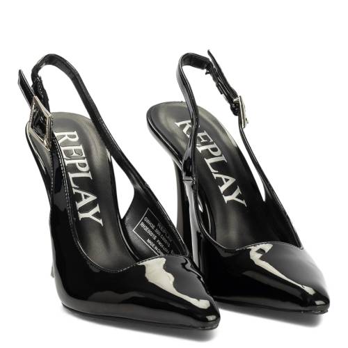 Λουστρίνι γόβα εξώφτερνη, μυτερή με λουράκι σε μαύρο χρώμα